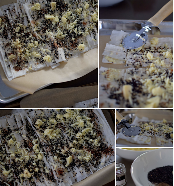 Divide the grated cheese between the two sheets and sprinkle over the seeds.