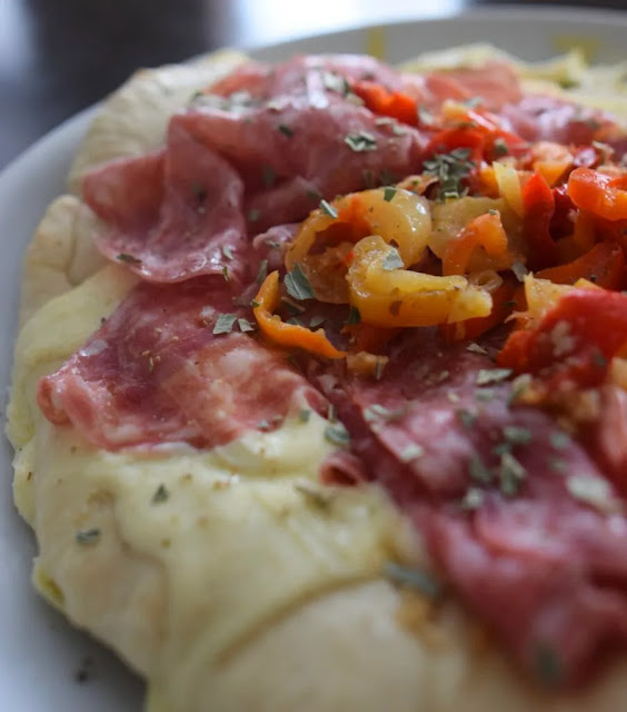 Bake, again, for about 10 minutes, until the cheese is melted. Remove from the oven and top with sliced soppressata, and then with the Spicy Pickled Peppers. Return to the oven, just briefly, to warm the toppings